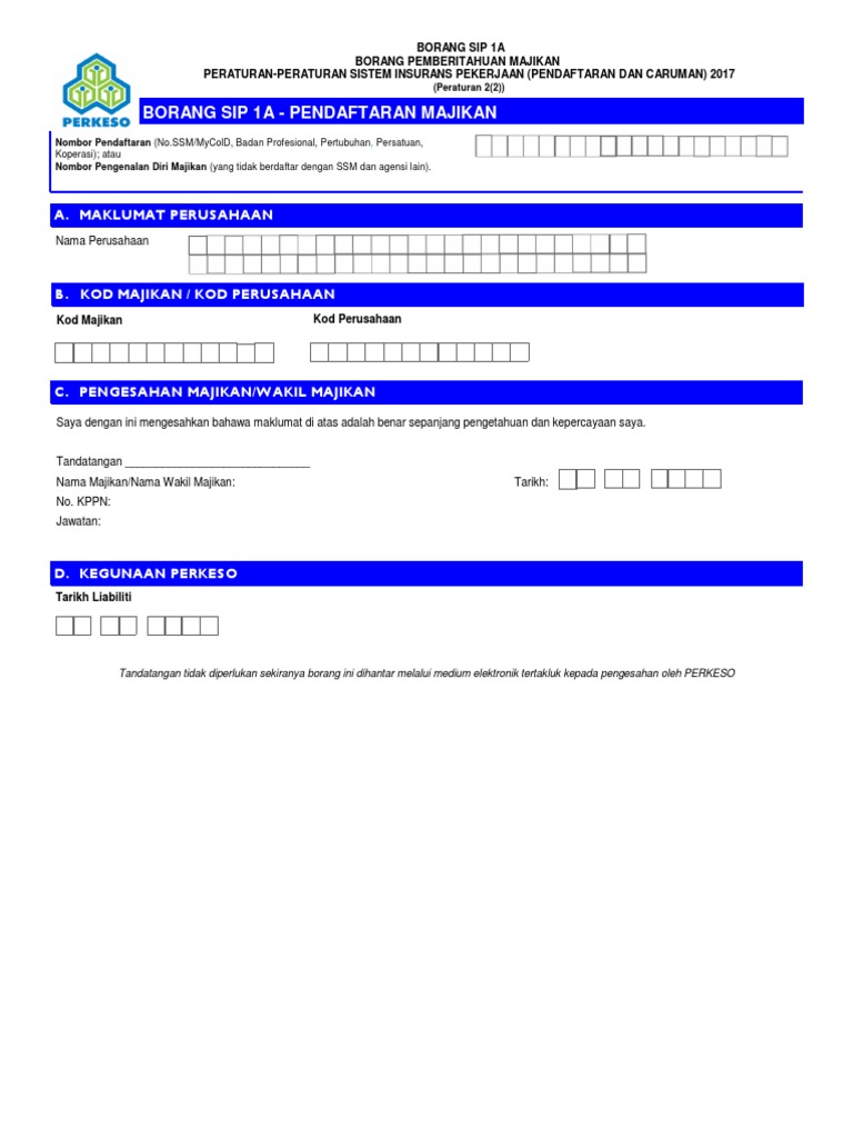 Atau nombor ptj kerajaan persekutuan atau kerajaan neger i. 5 bayaran balik caruman. Borang 1 borang pendaftaran majikan peraturan peraturan am keselamatan sosial pekerja 1971 peraturan 10 nombor pendaftaran no ssm mycold badan profesional pertubuhan persatuan koperasi. Bagi tujuan pendaftaran majikan dikehendaki mengisi borang pendaftaran majikan borang 1 serta borang pendaftaran pekerja borang 2 bersama dengan dokumen yang ditetapkan sila dapatkan senarai semak menerusi laman sesawang atau pejabat perkeso dan mengemukakannya ke pejabat perkeso berdekatan.