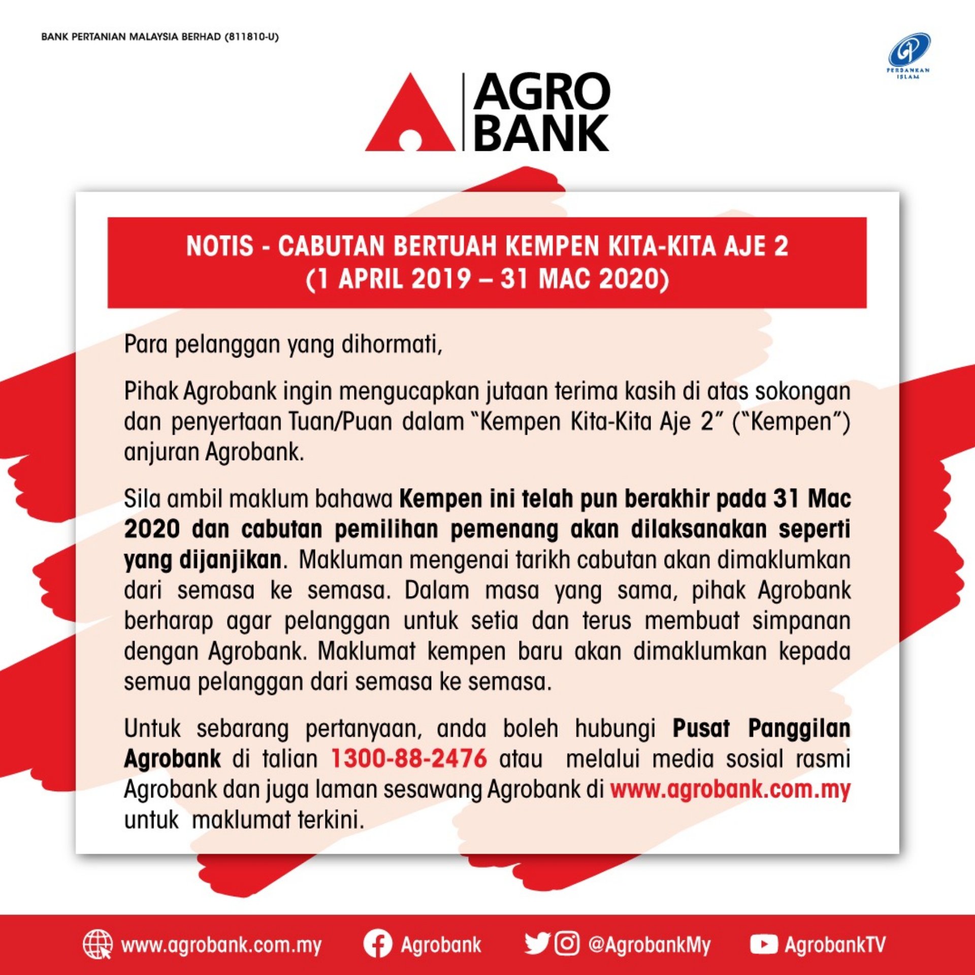 Agrobank على تويتر Pihak Agrobank Ingin Mengucapkan Jutaan Terima Kasih Di Atas Sokongan Dan Penyertaan Tuan Puan Dalam Kempen Kita Kita Aje 2 Kempen Anjuran Agrobank Sila Ambil Maklum Bahawa Kempen Ini Telah