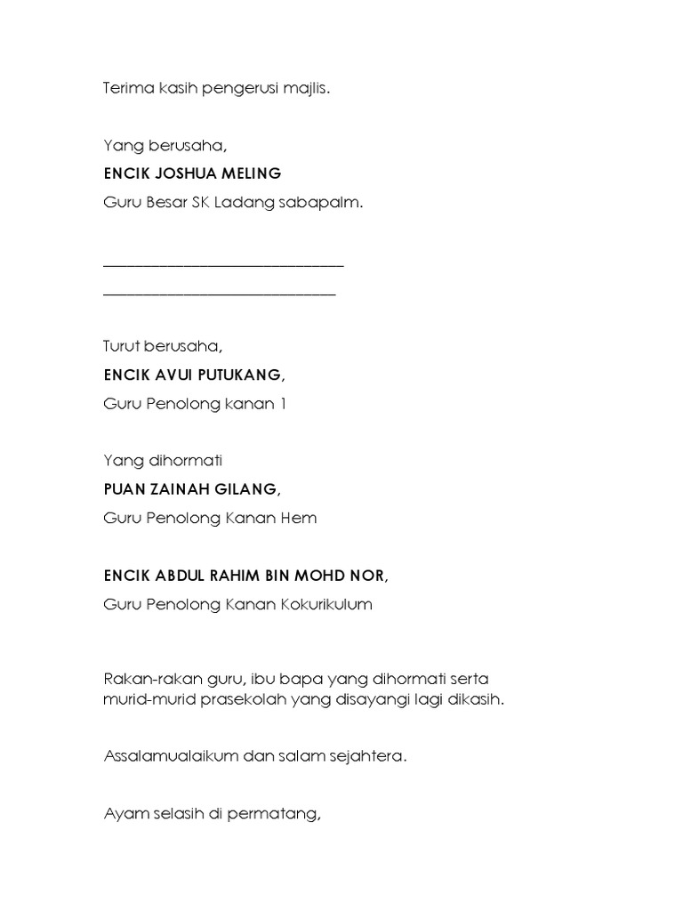Teks Ucapan Guru Prasekolah
