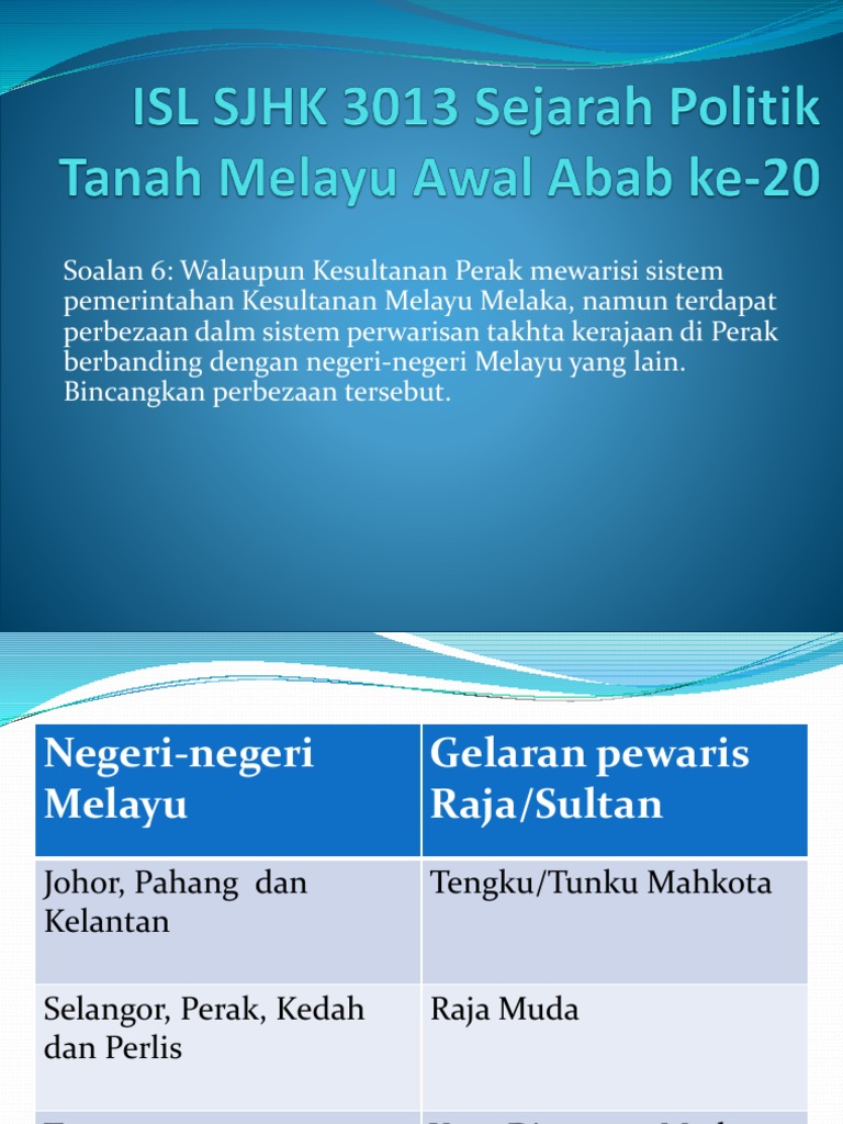M6 2 Bincangkan Perbezaan Sistem Pewarisan Takhta Kesultan Perak Dengan Negeri Negeri Melayu Yang Lain Pptx